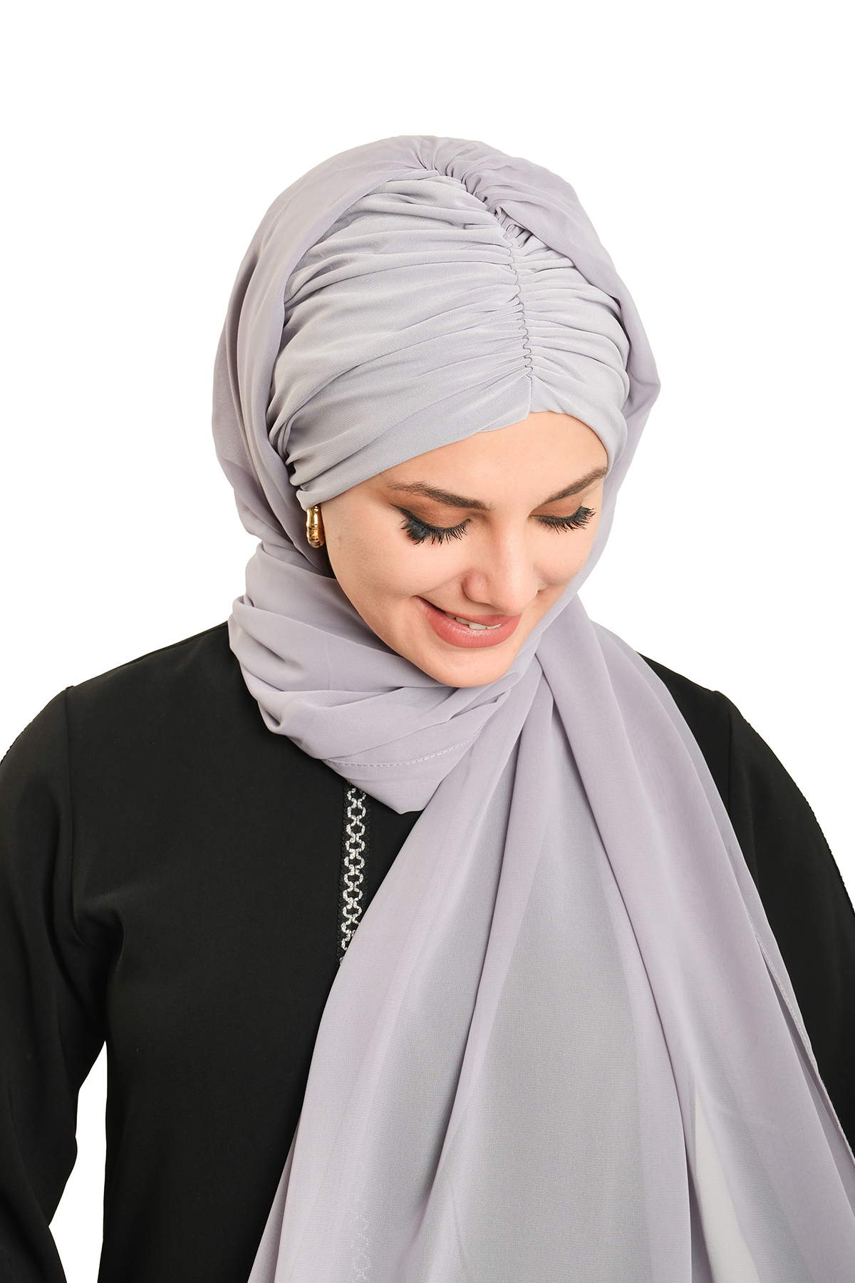 Gri Pratik Hazır Geçmeli Bone Şal Şifon Drapeli 2507_15