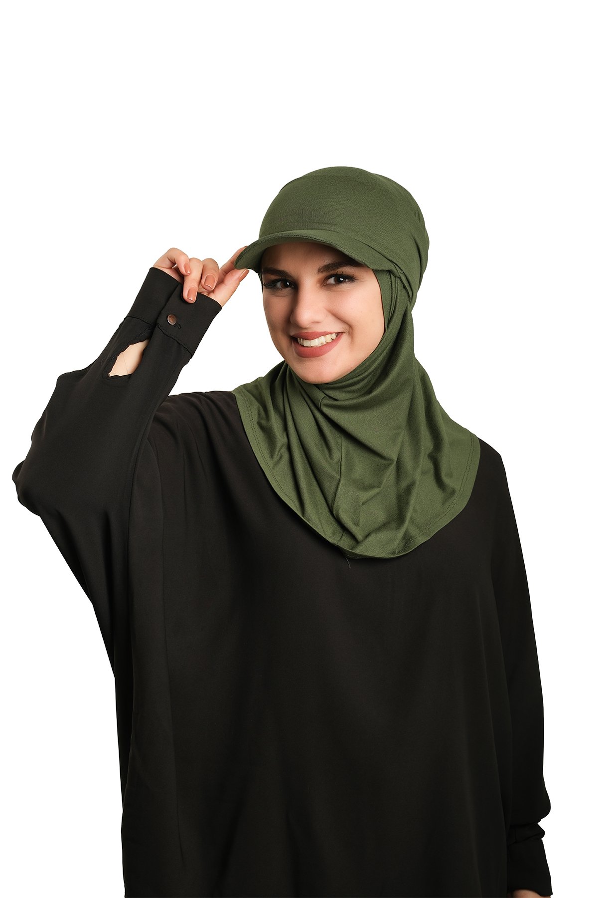 Haki Pratik Hazır Geçmeli Şapkalı Tesettür Eşarp Viskon Düz - Hürrem Bone 2513_09