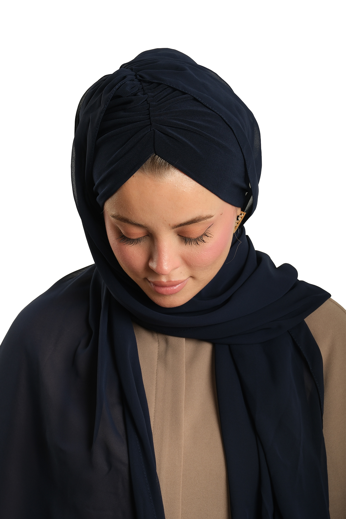 Lacivert Pratik Hazır Geçmeli Bone Şal Şifon Drapeli - Hürrem Bone 2507_02